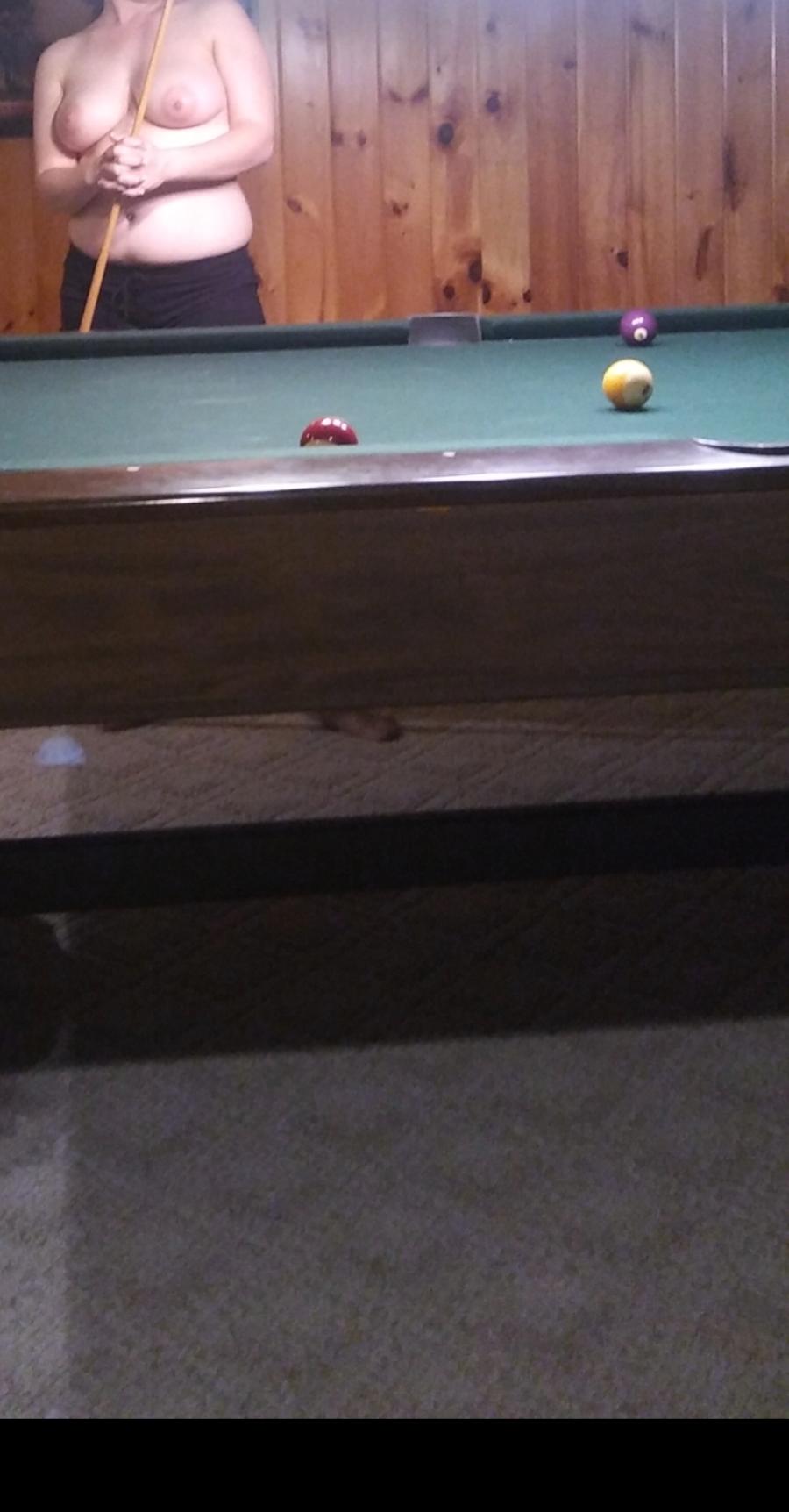 I decided we were playing "strip pool" for every ball you made in, the other person had to remove an article of clothing. Well...I was losing. 😂 I was quickly the only one naked, but no one seemed to mind. Hubby stepped out a few times to smoke a cigarette. I walked over and so he could get a better view and to push my boobs against the glass door lol. Of course, by the end of the night our friend was hard as a rock and I couldn't let that go to waste!