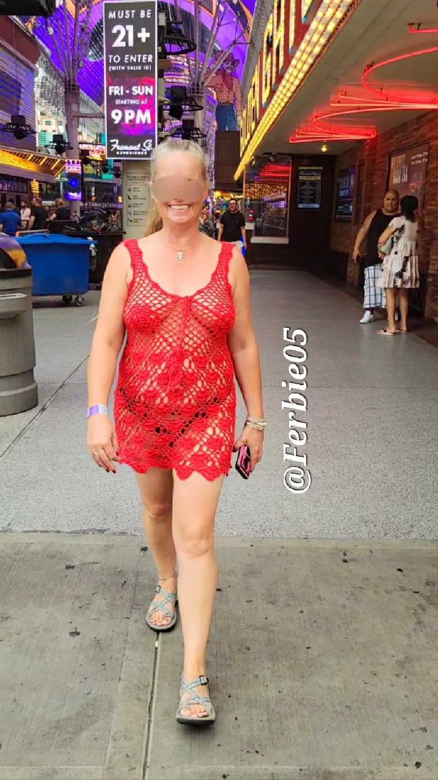 Freemont street in a see through knit dress with ONLY lacey black panties. I was having a blast being silly and the double takes I was getting from passersby in Vegas.