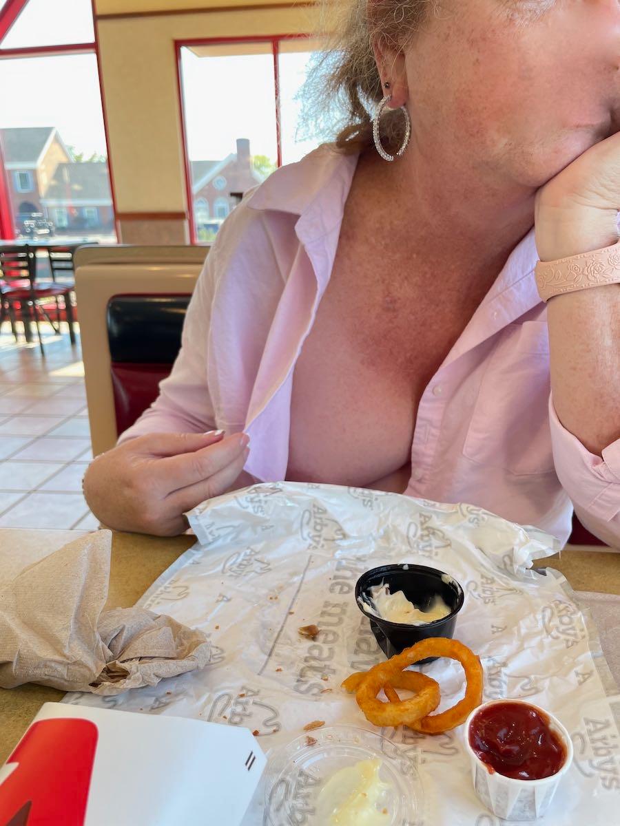 Picking up where we left off November 2024... We took a couple road trips, Ruuku wanted to drive so I offered a deal, she drives but a button get undone each state, highway, or bridge. Soon she was driving with her shirt wide open. When we stopped for dinner that buttons stayed open except for one. We included a couple from the hotel room so you can get a good look at her. We continued the game on the way home a few days later.