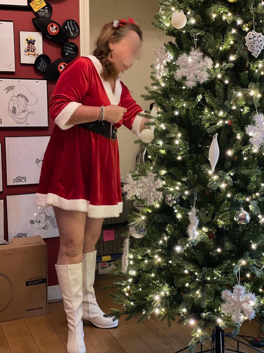 Christmas decorating in an sexy elf outfit sure gets my hubby interested in helping with the tree.